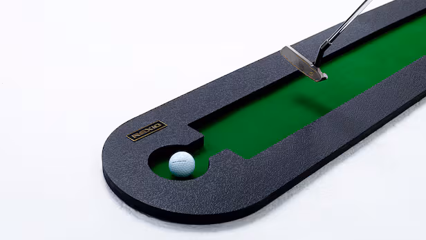 렉시오골프 퍼팅 연습기 ‘렉시오 퍼즐펏’은 집이나 회사에서 간단히 매트를 펼쳐 퍼팅 연습을 할 수 있는 제품이다. 실제 잔디와 저항력이 같은 벨벳 카펫 소재를 썼고, 공이 튀지 않도록 하는 벨보아 원단을 혼합했다.