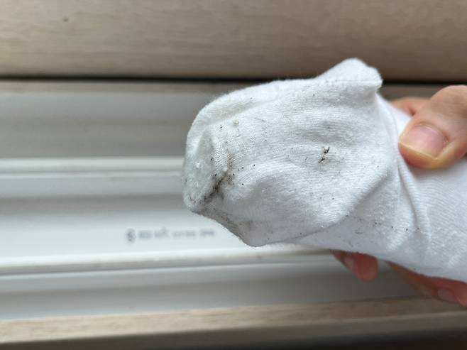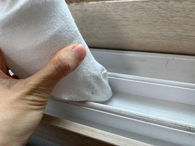 먼지가 오래되어 굳은 경우, 신문지를 창틀 크기에 맞춰 자른 후 분무기로 물을 뿌려 먼지를 불립니다.