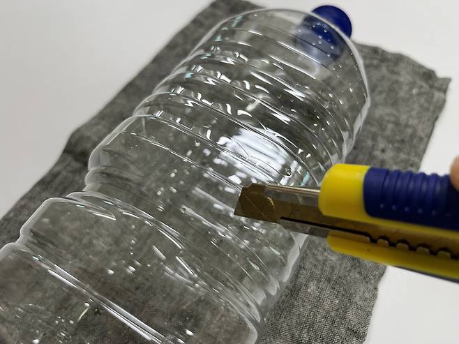 빈 생수병은 물기를 제거한 뒤 중간 정도 지점을 칼로 잘라주세요. 아랫부분을 사용하는데 바닥 부분도 자르세요.