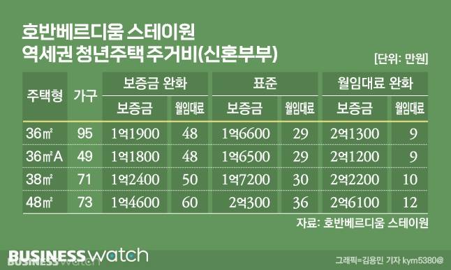 신혼부부형도 마찬가지로 '표준형'은 보증금 1억6500만~2억300만원에 월임대료 29만~36만원 수준이지만 '월임대료 완화형'으로 보증금 2억1200만~2억6100만원에 월임대료는 9만~12만원까지 줄일 수 있다.