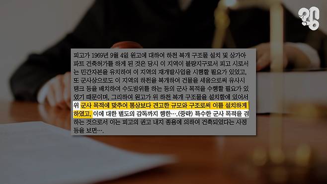 유진상가도 지어질 당시 정부가 어떤 군사적 목적으로, 설계에 어떤 지시를 했는지 전부 공개된 바가 없었는데, 1985년 시공사인 신성건설이 서울시를 상대로 하천사용료 소송을 낸 것에 대법원이 ‘군사 목적에 맞추어 통상보다 견고한 규모와 구조로써 이를 설치하게 하였고~’라고 판결하며(84누343) 군사적 목적이 있었다는 점이 세상에 공개되었다.