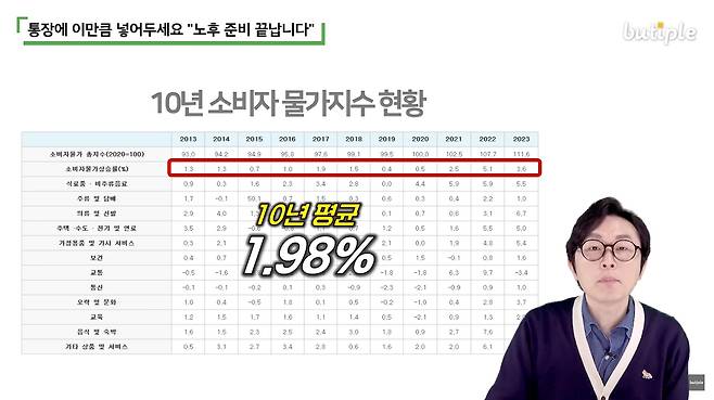 여기에 지난 10년 평균 소비자 물가상승률 1.98%를 적용하여 30년 후의 가치를 계산하면 노후 자금으로 필요한 돈은 총 7억 2,209만 원이 됩니다.