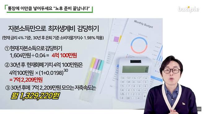 30년 후 은퇴를 한다고 했을 때, 현재 가치로 연 1,604만 원의 노후자금을 이자소득으로 충당하기 위해서는 4억 100만 원(금리 4% 기준)이 필요한데요.