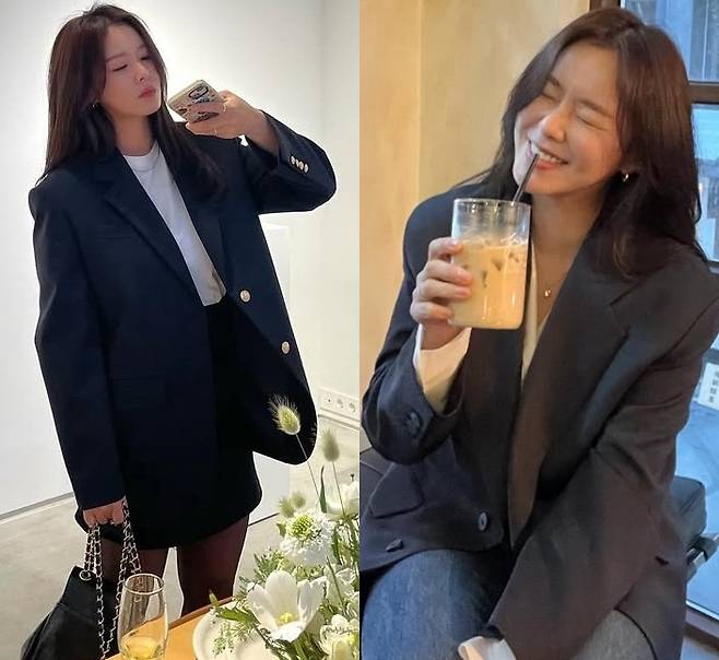 동일한 블레이저를 활용해 데님 팬츠와 함께 보다 캐주얼하고 편안한 분위기를 연출했습니다.