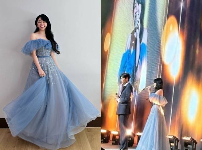 김소현은 블루 오프숄더 시폰 드레스를 착용해 청순하면서도 우아한 자태를 뽐냈습니다.