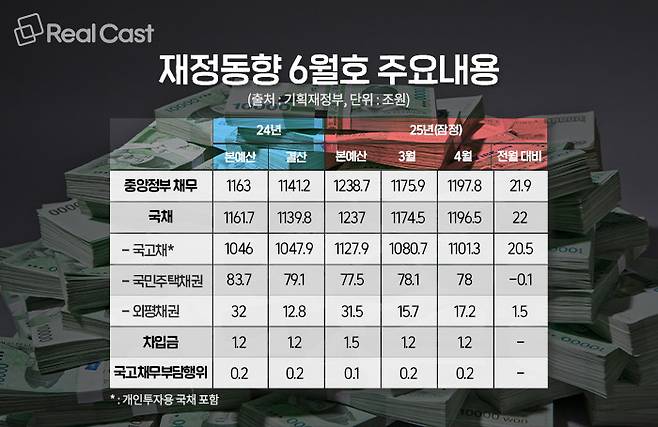중앙정부 채무 잔액은 4월 말 기준 1197조 8000억 원으로 3월 말에 비해 21조 9000억 원 증가한 것으로 확인됐습니다.