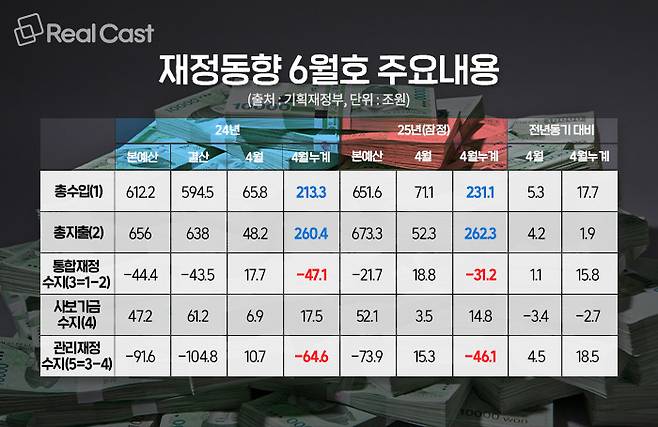 통합재정수지에서 국민연금 등 사회보장성기금을 제외해 실질적인 나라살림을 보여주는 지표인 관리재정수지는 46조 1000억 원 적자를 기록했습니다. 통합재정수지가 소폭 개선되면서 2024년(64조 6000억 원)보다 18조 5000억 원 개선되기는 했으나 관리재정수지 적자 규모는 4월 기준 지난해와 2020년(56조 6000억 원)에 이어 역대 세 번째입니다.