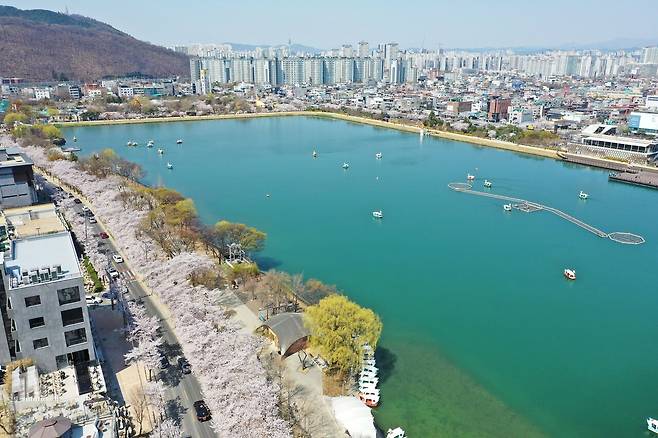 금호강을 따라 낭만적인 대구 벚꽃을 즐길 수 있는 곳, 바로 동촌유원지인데요. 넓은 유원지 곳곳에는 벚나무가 심어져 있어 산책, 피크닉, 자전거, 오리배를 타며 여유롭게 벚꽃을 감상할 수 있습니다.