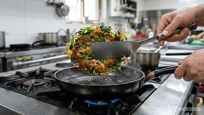 → 한쪽 면을 충분히 익힌 뒤 뒤집어야 모양이 유지된다.