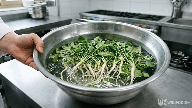 냉이 180g은 먼저 큰 볼에 물을 받아 담근다. 뿌리 사이에 낀 흙을 손가락으로 부드럽게 훑어 빼낸다. 물을 두세 번 갈아가며 씻은 뒤 흐르는 물에 마지막으로 헹군다.
