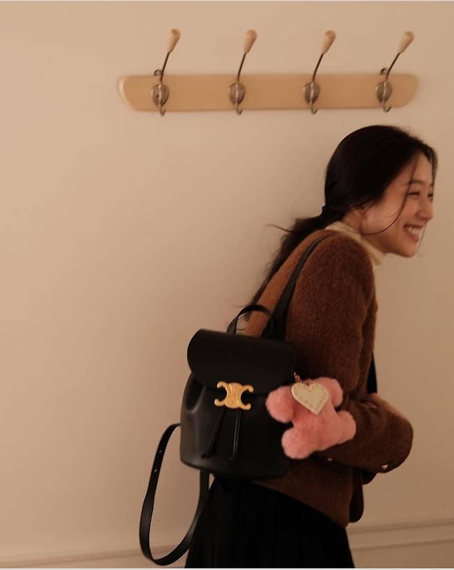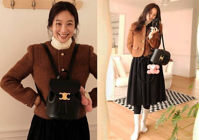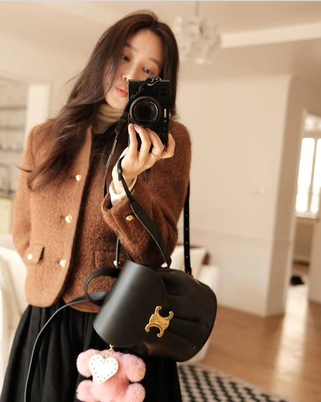 특히 골드 버튼이 포인트가 된 재킷과 블랙 미니 백은 고급스러움을 더했으며, 사랑스러운 핑크 퍼 액세서리로 귀여운 감각을 살렸다.