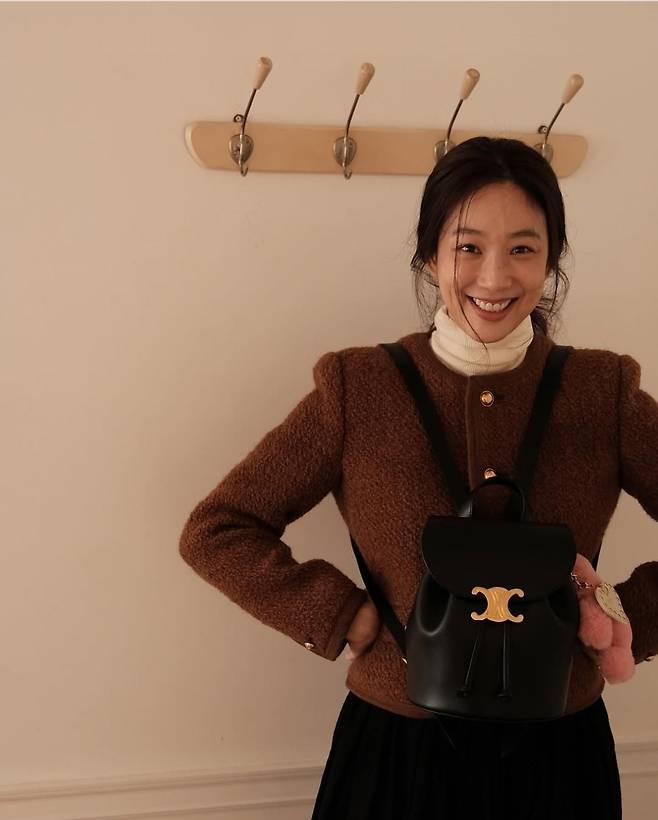 정려원은 브라운 컬러의 트위드 재킷과 화이트 터틀넥 니트로 포근한 무드를 연출했다.