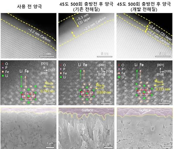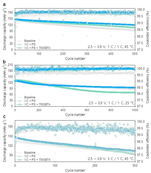 KAIST 생명화학공학과 문현규 연구원은 “개발된 전해질 첨가제는 내열성과 전도성이 우수한 전극 계면 층을 형성한다. 이로 인해 리튬인산철 양극과 흑연 음극으로 만들어진 전지의 구동 온도 45도에서 500회, 25도에서 1,000회 충·방전 후에도 각각 초기 용량의 80.8%, 73.3%를 유지했다”고 밝혔다. 이는 첨가제를 사용하지 않은 경우보다 각각 20.4%, 8.6% 향상된 결과다.