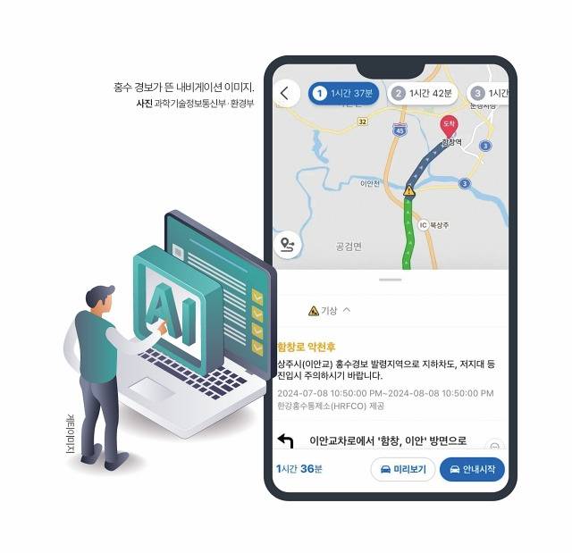 2024년 7월부터 집중호우 때 침수 위험 지역 주변을 운행하는 차량은 내비게이션이나 지도 애플리케이션(앱)을 통해 이 같은 알림을 실시간으로 받을 수 있게 됐습니다. 환경부와 과학기술정보통신부가 ‘AI를 활용한 홍수안전망’을 구축하면서입니다.