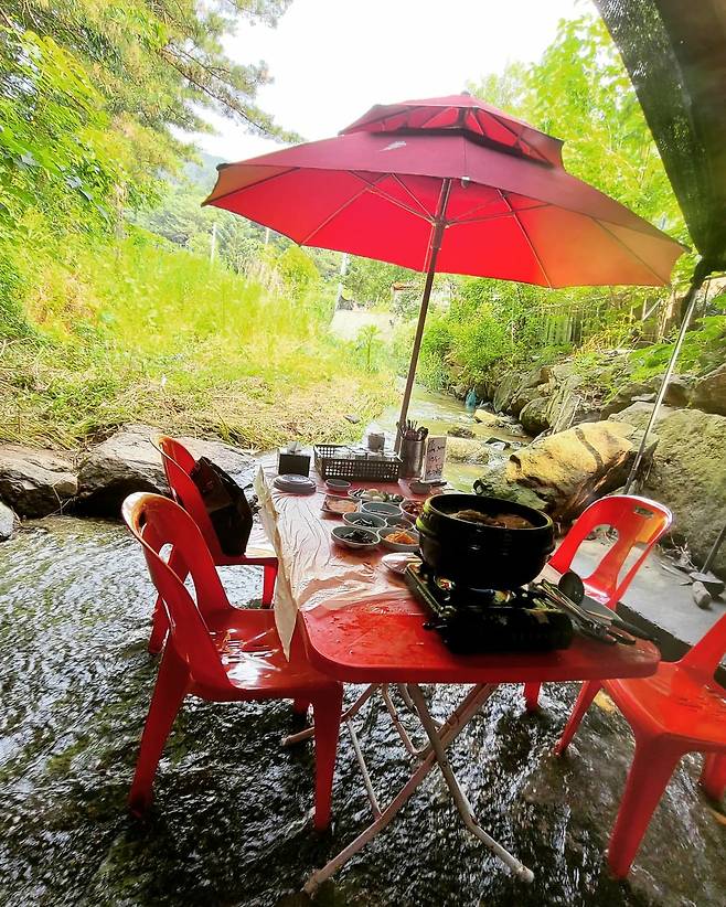 [식신 TIP] 나무그늘 아래에서 뜨끈한 백숙과 함께 낮술 한 잔~ 보글보글 라면도 끓여 먹을 수 있어요. 같은 라면도 계곡물에서 먹으면 두 배 맛있다는 거 이미 아시죠?