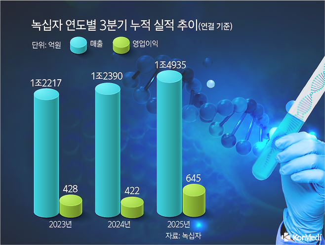 녹십자의 3분기 누적 매출은 1조4935억원, 영업이익은 645억원으로 2024년 3분기(매출 1조2390억원, 영업이익 422억원)나 2023년 3분기(매출 1조2217억원, 영업이익 428억원)와 비교해 개선된 모습이다.