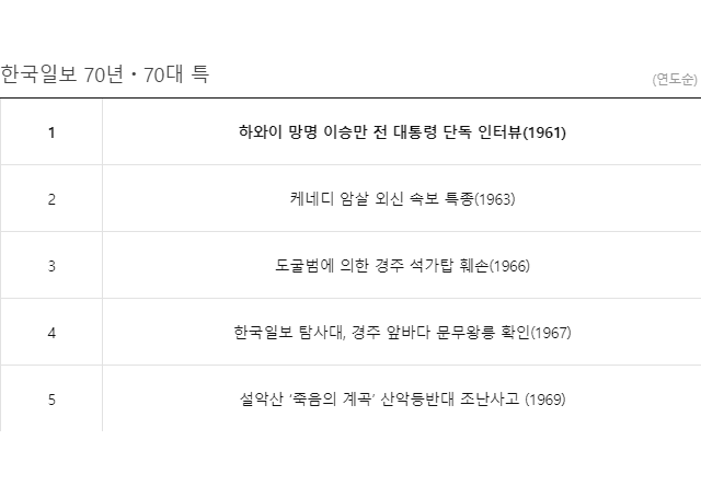 매일매일, 시시각각 한국일보 플랫폼은 빠르고 깊은 뉴스와 정보를 생산하고 있다. 1954년 창간 이래 역사의 물줄기를 바꾸거나 국민적 감동을 이끌어낸 수많은 특종이 발굴됐다. 지난 70년 다수의 특종과 사건 중 파장이 컸던 내용들을 연도별로 안배해 선정한 ‘70대 특종’을 매주 월요일 뉴스이용자들에게 소개한다.