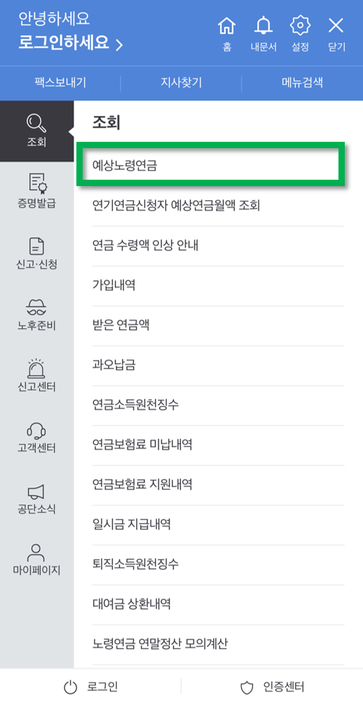 모바일 앱 ‘내 곁에 국민연금’ → 전체 메뉴 → 예상노령연금