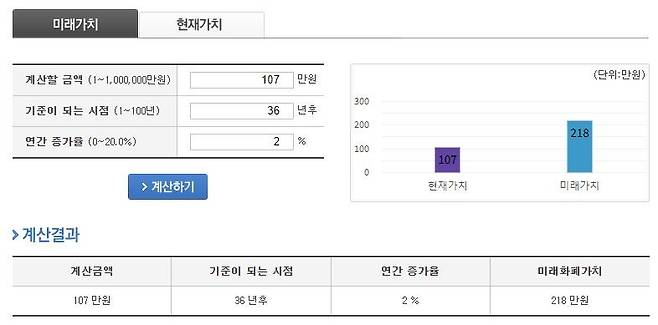 예를 들어 2024년 화폐가치 기준 예상연금액이 107만 원이라면, 36년 후인 2060년에는 매년 물가가 2%씩 상승할 것이라고 가정했을 때 218만 원이 되는 것이죠!