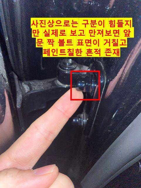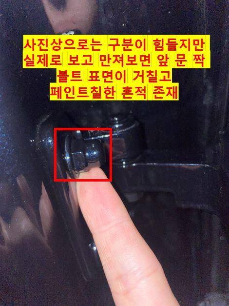 실제로 그가 올린 사진을 보면 흰색 BMW 차량의 앞 문짝에 볼트를 해체했던 것으로 추정되는 흔적이 보인다. 그는 “흰색 차량이라 볼트를 푼 흔적이 잘 보인다. 녹슨 부분도 있다.”라고 비난했다.
