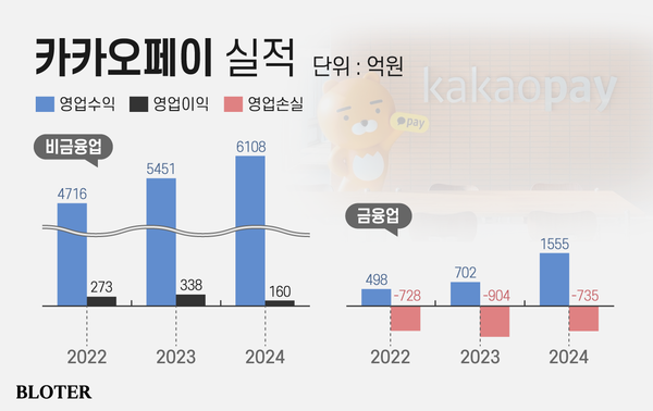 카카오페이는 현재 적자가 지속되고 있다. 영업손실은 △2022년 455억 원 △2023년 566억 원 △2024년 575억 원이다. 영업수익은 △2022년 5214억 원 △2023년 6154억 원 △2024년 7662억 원이다. 카카오페이의 영업수익은 비금융업과 금융업(자회사인 카카오페이손해보험·카카오페이증권)에서 나온다. 적자를 내고 있는 것은 금융업이다.