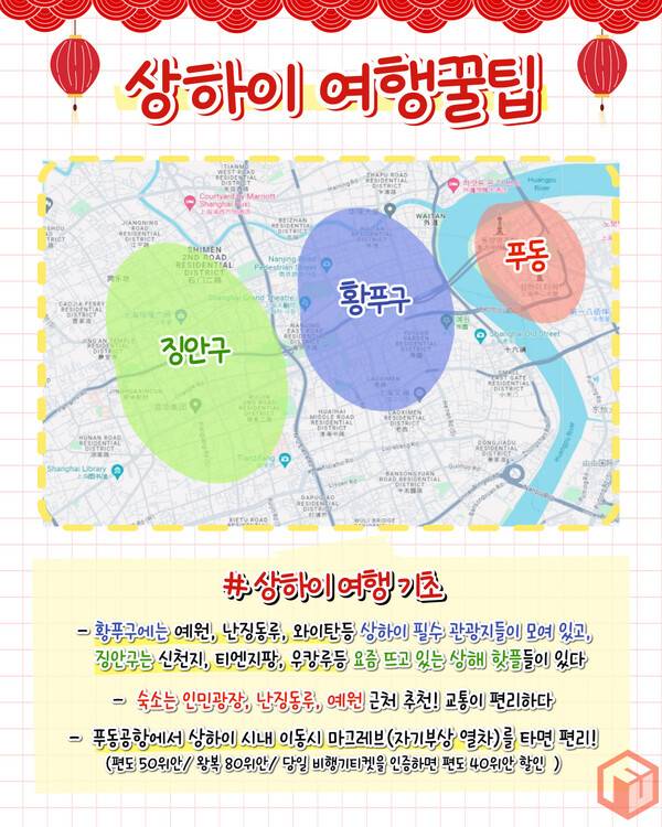 상하이는 황푸구에는 예원, 난징동루, 와이탄등 상하이 필수 관광지들이 모여 있고, 징안구는 신천지, 티엔지팡, 우캉루등 요즘 뜨고 있는 상해 핫플들이 모여있어 구역별로 하루씩 잡아 여행을 하시면 좋습니다.