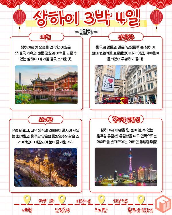 상하이 1일차는 상하이 필수 여행지들이 몰려있는 황푸구입니다. 상하이의 옛모습을 간직하고 있는 '예원'에서 중국 전통가옥과 정원을 즐길 수 있고 다양한 중국 길거리음식을 맛보실 수 있습니다.