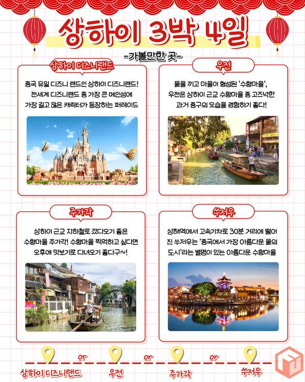 중국 상하이는 한국에서 비행기 2시간 10분 거리의 가까운 여행지입니다. 상하이는 중국의 현대와 과거가 공존하는 도시로 중국 유일 디즈니랜드까지있어 3박 4일 여행으로도 알차게 여행을 즐기고 오기 좋은 곳입니다.