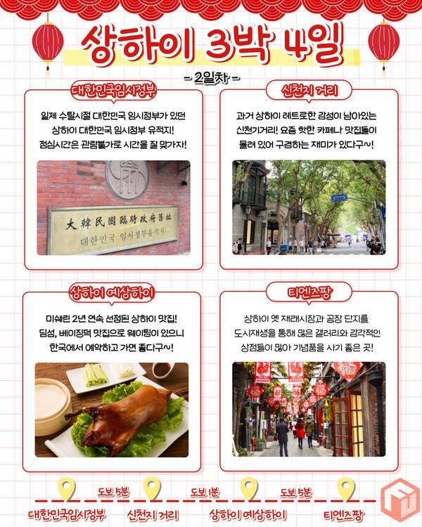 상하이 2일차에는 조금 더 세련된 상하이를 즐기면 좋습니다. 한국의 일제 수탈시절 임시정부가 있던 '대한민국 임시정부'는 상하이를 방문하시면 꼭 방문해야하는 관광지입니다. 점심시간 내에는 관람이 불가함으로 시간을 잘 맞춰 방문하셔합니다.