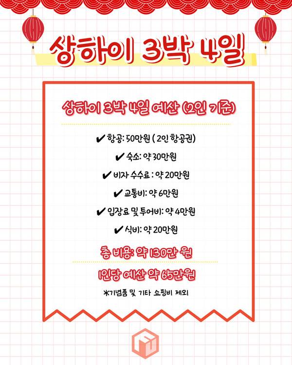 마지막으로 상하이 3박 4일 예상 경비입니다. 항공료, 비자 수수료, 숙소 모든 경비 1인당 예산은 약 65만원으로 예상됩니다. 기념품 및 기타 쇼핑비는 제외했음으로 이를 더해도 100만원 이하로 다녀오기 좋은 가성비있는 해외여행지입니다.