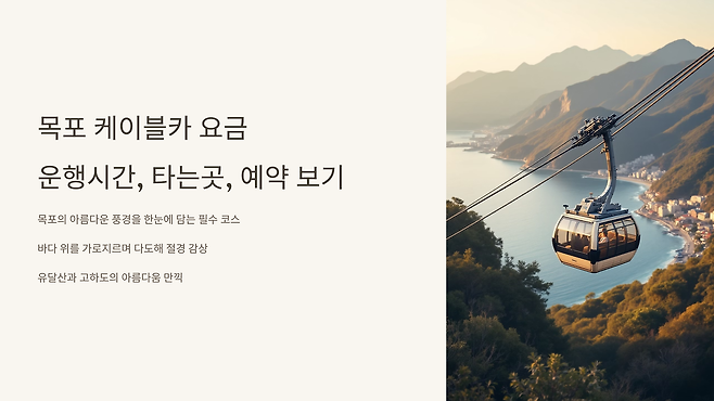 목포의 아름다운 풍경을 한눈에 담을 수 있는 목포 해상 케이블카는 여행객들에게 필수 코스로 손꼽힙니다. 바다 위를 가로지르며 다도해의 절경을 감상하고, 유달산과 고하도의 아름다움을 만끽할 수 있는 특별한 경험을 선사합니다. 본 글에서는 목포 해상 케이블카의 요금, 운행시간, 탑승 장소, 그리고 예약 정보까지 상세하게 안내하여 여러분의 목포 여행 계획에 도움을 드리고자 합니다.