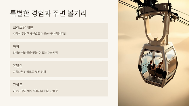 목포 해상 케이블카에는 일반 캐빈과 바닥이 투명한 크리스탈 캐빈 두 종류가 있습니다. 크리스탈 캐빈을 이용하면 발 아래로 펼쳐지는 아찔하고 생생한 바다 풍경을 만끽할 수 있어 더욱 특별한 경험을 선사합니다. 요금은 일반 캐빈보다 다소 높으니 참고하시기 바랍니다.