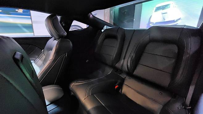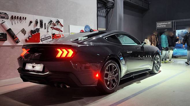 해당 전시 차량이 5.0L 급 V8 자연흡기 엔진을 채택하고 있는 머스탱 GT다. 환경부담으로 인해 고배기량 엔진은 거의 멸종에 가까워진 시대, 그럼에도 V8 엔진을 출시하는 포드의 행보를 보면 머스탱의 헤리티지가 어떻게 가꾸어져온 것인지 새삼 깨닫는다. GT는 라디에이터 그릴의 크기나 범퍼 형상이 더 복잡해지고, 보닛의 에어덕트는 물론 형상 자체가 달라지는 디자인상의 차이점이 있다. GT 휠 내부에는 브렘보 로고가 각인된 레드 캘리퍼가 돋보이며 펜더에 5.0 레터링이 추가되어 있다. 뒤에는 더욱 공격적인 디퓨져와 스포일러가 채택된다.
