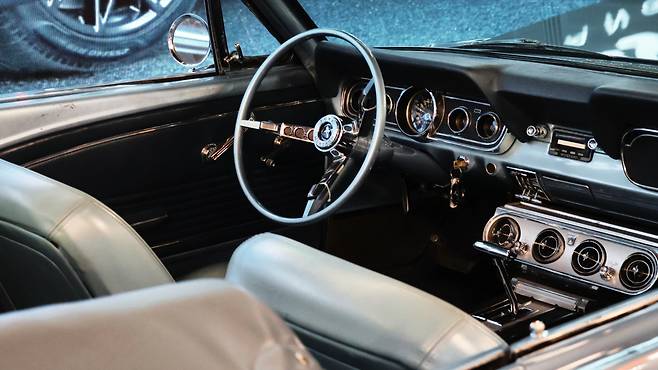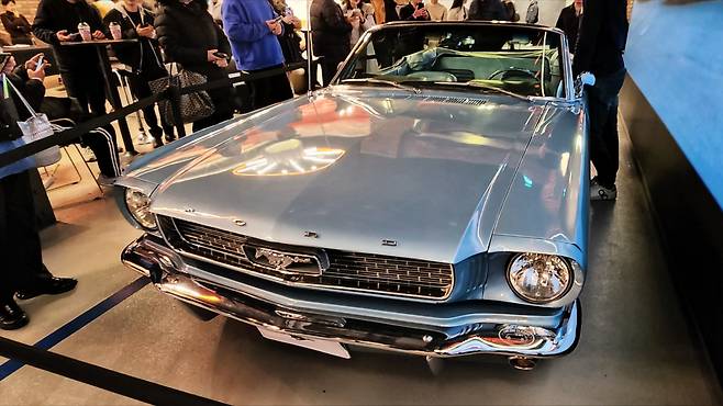최신형 머스탱을 접하기 전 클래식 모델의 향수를 느껴보았다. 푸른빛의 차체 색감과 크롬 가니시들의 조화가 굉장히 화려하게 느껴진다. 원한다면 거대한 고배기량 엔진을 품을 수 있는 긴 보닛이 있고, 머스탱의 심볼로 장식되어 있는 전면 그릴이 대담한 인상을 남긴다. 후미등에 채택된 3분할 디자인은 현재까지도 연결되는 머스탱의 핵심 디자인 요소이다. 컨버터블 차량인 만큼 실내공간도 가까이서 살펴볼 수 있었다. 유독 그립이 얇아 보이는 스티어링 휠과 기어 노브가 독특했고, 인테리어의 각종 크롬색 장식물이 화려함을 자아낸다.