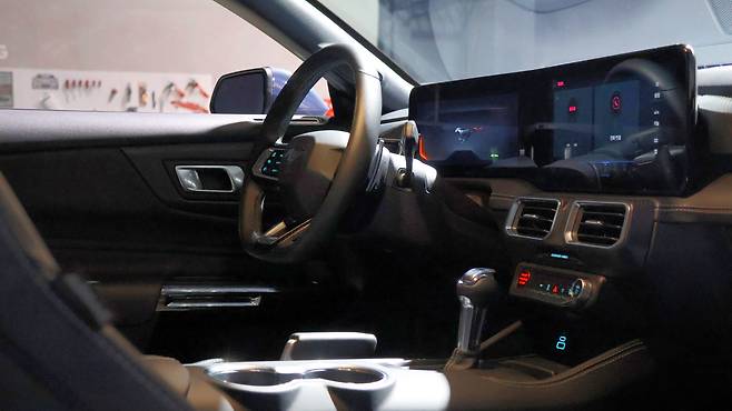 그렇듯 헤리티지와 트렌드를 적정선에서 조율하여 공개된 7세대 머스탱의 인테리어였다. 새롭게 디자인된 D 컷 스티어링 휠 자체는 두꺼운 그립과 입체적인 형상으로 드라이빙의 재미를 자극해 줄 것이다. 디지털 클러스터는 인리얼 엔진 3D를 탑재하여 업계 최고 수준의 그래픽을 자랑한다고 한다. 도어 캐치나 도어스텝에 점등되는 무드램프가 최신화된 느낌을 더해주지만, 또 부츠타입 기어 레버와 핸드 브레이크가 포니카의 향수를 가져온다. 특히 사이드 브레이크 자체는 전자식이나, 헨드 레버 채택과 드리프트 모드를 따로 지원한다는 설명이다.