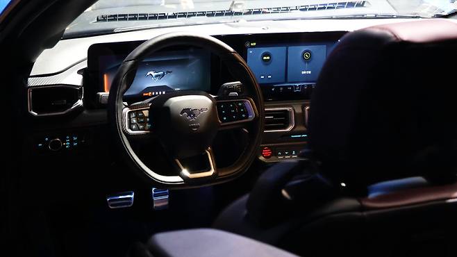 그렇듯 헤리티지와 트렌드를 적정선에서 조율하여 공개된 7세대 머스탱의 인테리어였다. 새롭게 디자인된 D 컷 스티어링 휠 자체는 두꺼운 그립과 입체적인 형상으로 드라이빙의 재미를 자극해 줄 것이다. 디지털 클러스터는 인리얼 엔진 3D를 탑재하여 업계 최고 수준의 그래픽을 자랑한다고 한다. 도어 캐치나 도어스텝에 점등되는 무드램프가 최신화된 느낌을 더해주지만, 또 부츠타입 기어 레버와 핸드 브레이크가 포니카의 향수를 가져온다. 특히 사이드 브레이크 자체는 전자식이나, 헨드 레버 채택과 드리프트 모드를 따로 지원한다는 설명이다.