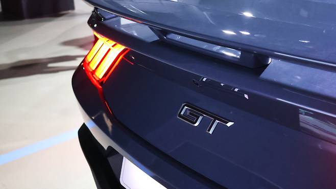 해당 전시 차량이 5.0L 급 V8 자연흡기 엔진을 채택하고 있는 머스탱 GT다. 환경부담으로 인해 고배기량 엔진은 거의 멸종에 가까워진 시대, 그럼에도 V8 엔진을 출시하는 포드의 행보를 보면 머스탱의 헤리티지가 어떻게 가꾸어져온 것인지 새삼 깨닫는다. GT는 라디에이터 그릴의 크기나 범퍼 형상이 더 복잡해지고, 보닛의 에어덕트는 물론 형상 자체가 달라지는 디자인상의 차이점이 있다. GT 휠 내부에는 브렘보 로고가 각인된 레드 캘리퍼가 돋보이며 펜더에 5.0 레터링이 추가되어 있다. 뒤에는 더욱 공격적인 디퓨져와 스포일러가 채택된다.