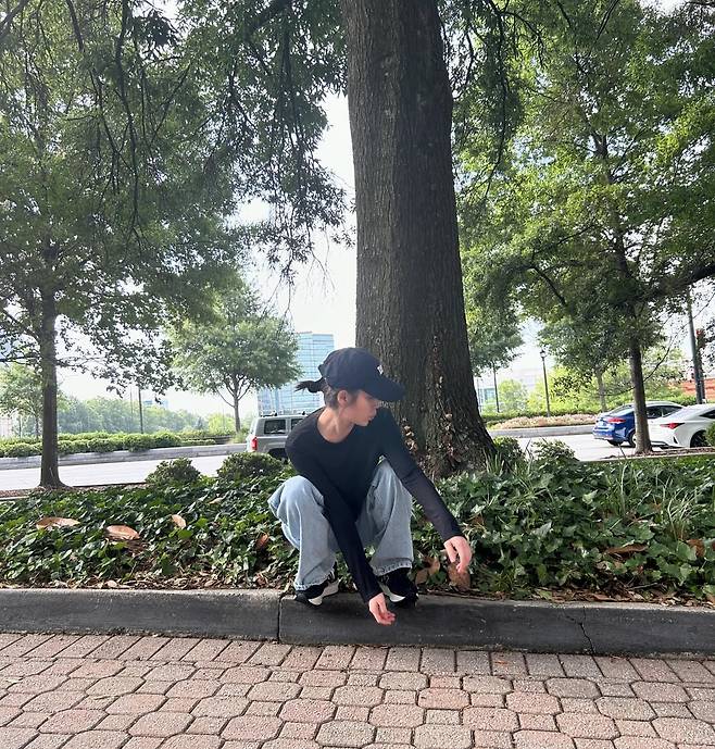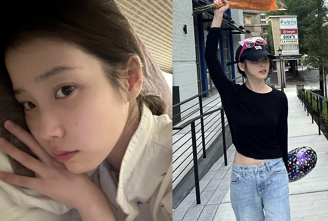 사진 속 아이유는 크롭티에 청바지를 입은 채 일상을 보내는 모습입니다.