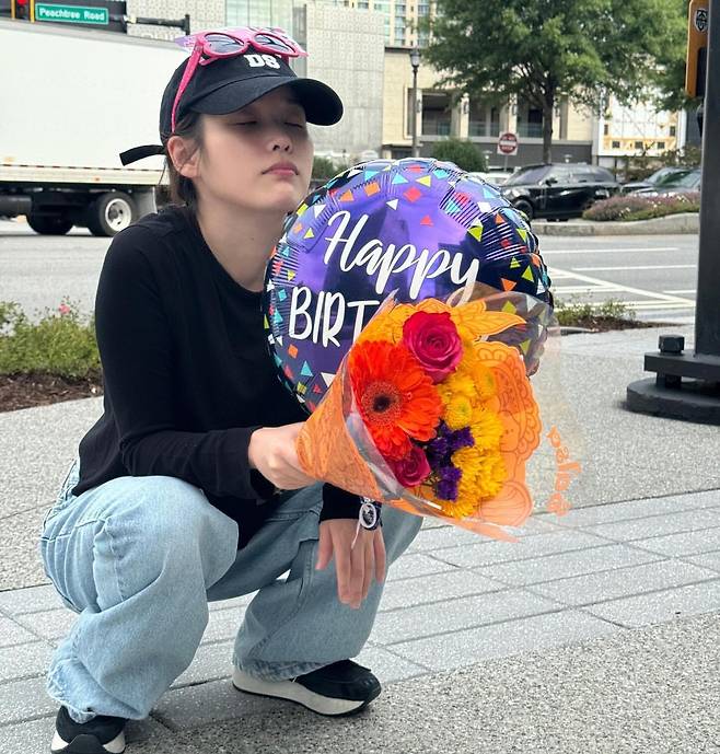 사진 속 아이유는 크롭티에 청바지를 입은 채 일상을 보내는 모습입니다.
