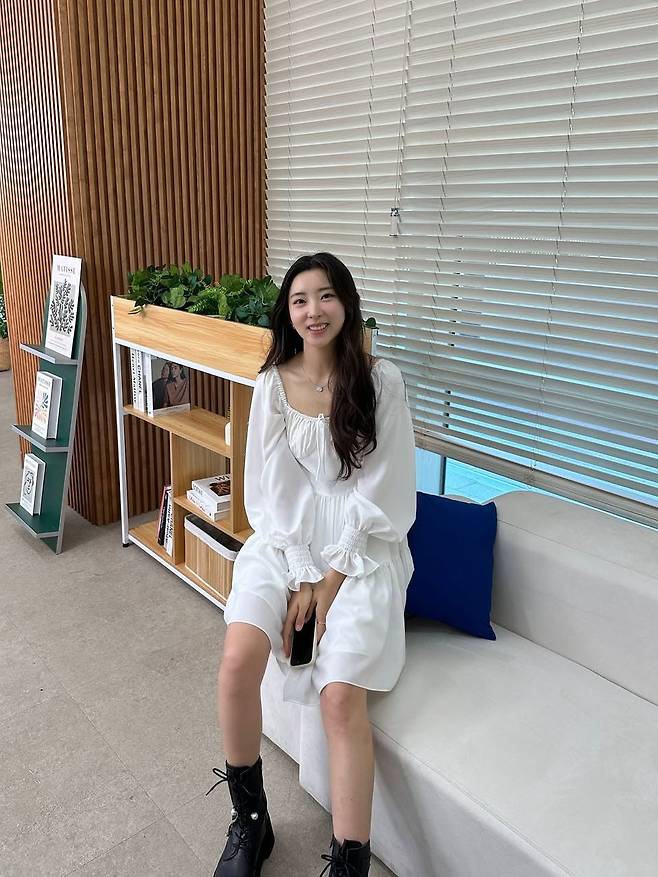 첫 번째 룩에서는 루즈한 화이트 셔츠를 원피스처럼 연출해 내추럴하면서도 세련된 분위기를 강조했다. 셔츠 아래로 은은하게 비치는 레이스 팬츠가 은근한 페미닌 무드를 더했으며, 블랙 니트 백은 미우미우 로고 포인트로 스타일에 위트를 더했다. 전체적인 톤은 화이트와 뉴트럴 컬러로 통일해 깔끔하고 시원한 느낌을 주며, 실내에서도 여름 감성을 잃지 않는 스타일링이다.
