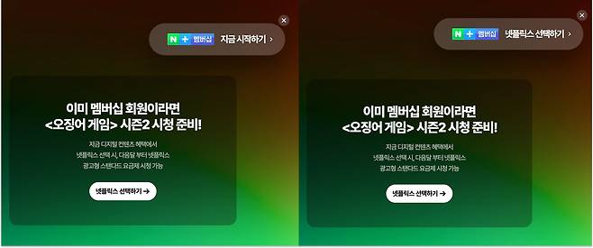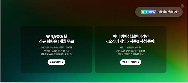 재밌는 건 상단의 플로팅 CTA 영역이야. 네이버 플러스 멤버십을 이미 가입했다면 '네이버 플러스 멤버십 지금 시작하기', 가입헀다면 '넷플릭스 선택하기'가 문구로 등장해. 웹페이지에 접속한 사람의 상태에 따라 CTA 영역을 개인화했다는 점이 좋았어.