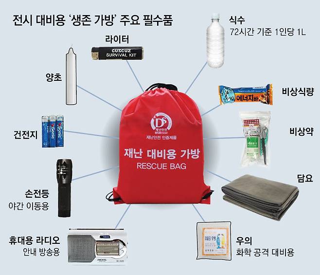 대표적 준비물로는 레이션, 응급약품, 각종 방재용품, 외화, 비트코인 지갑 등이 있다.