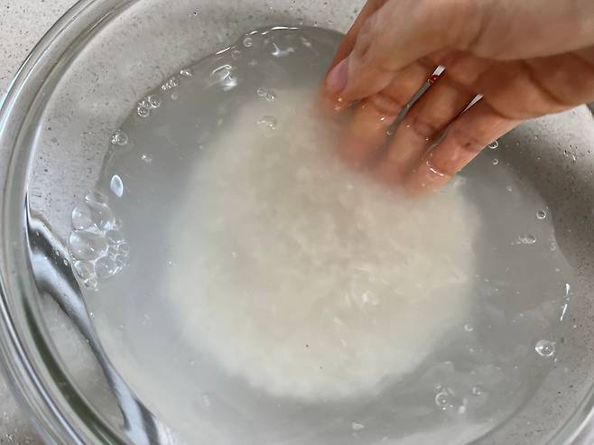 쌀을 세척할 때는 손으로 부드럽게 저으면서 살살 세척합니다.