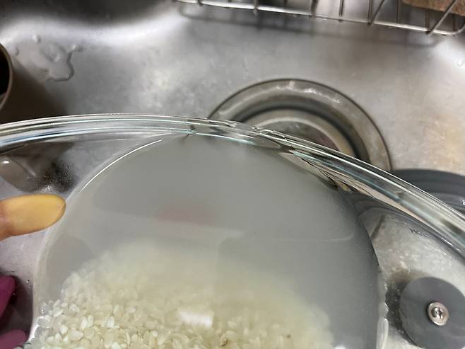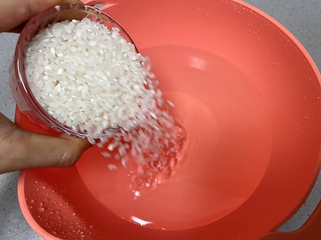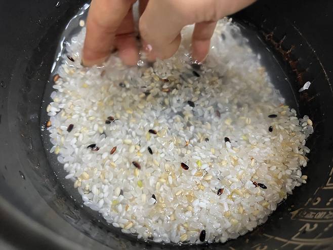 물을 먼저 넣는 것이 아니라, 반드시 쌀을 먼저 넣고 물을 부어야 합니다. 물을 먼저 받아 놓으면 쌀 속 먼지나 불순물이 물에 퍼지고 다시 쌀이 그 물을 흡수하게 됩니다.