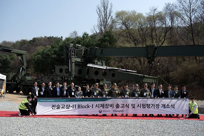 방위사업청(이하 방사청)이 충북 음성에서 우리 군의 작전 수행 능력을 한층 끌어올릴 ‘한국형 전술교량-II Block-I’의 시제 장비 출고식을 8일 개최했다. 이날 출고식에는 합참, 육군, 국방기술품질원, 국방기술진흥연구소 등 관계자들이 참석했다.