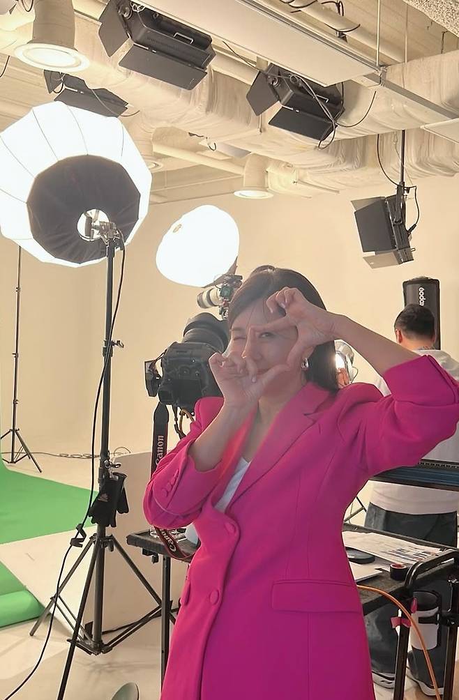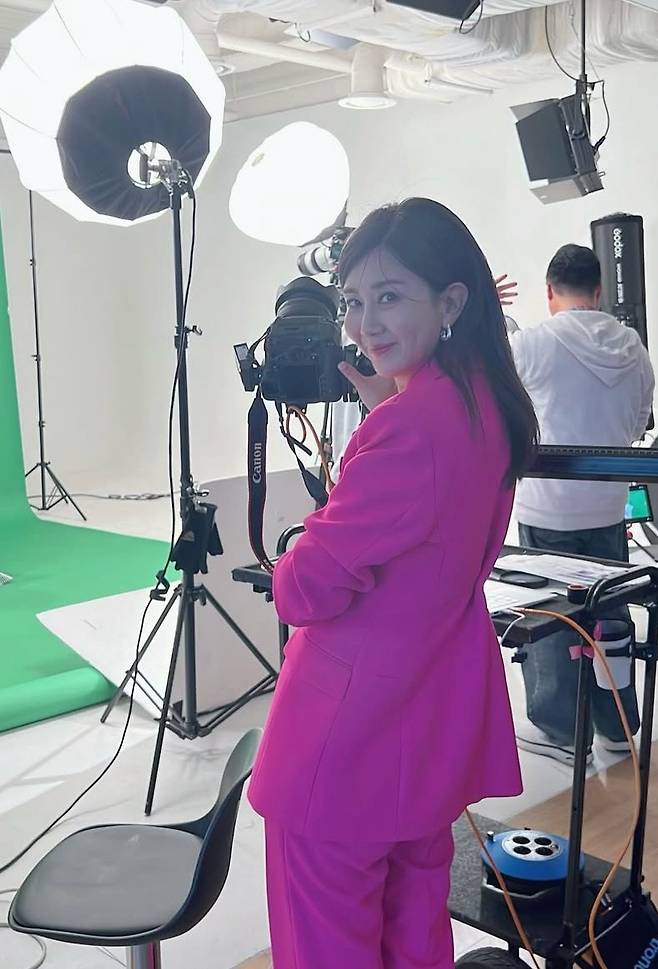 강렬한 핫핑크 컬러의 테일러드 재킷을 착용해 세련되고 당당한 분위기를 강조했습니다.