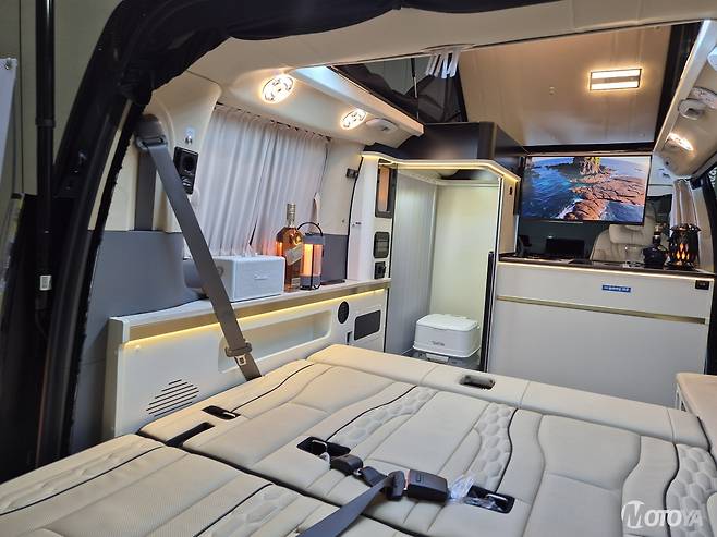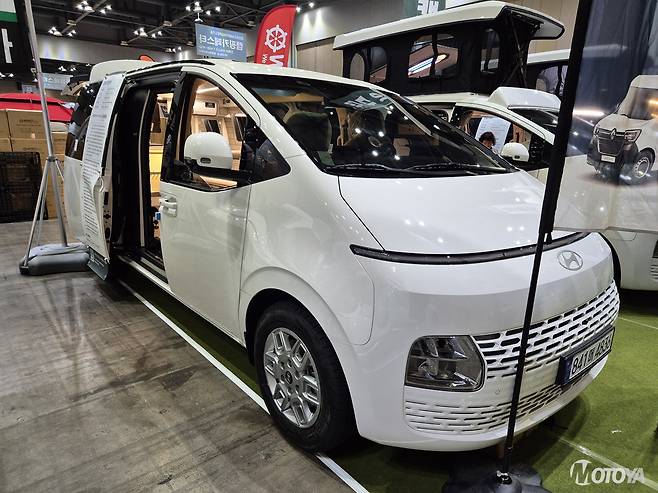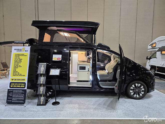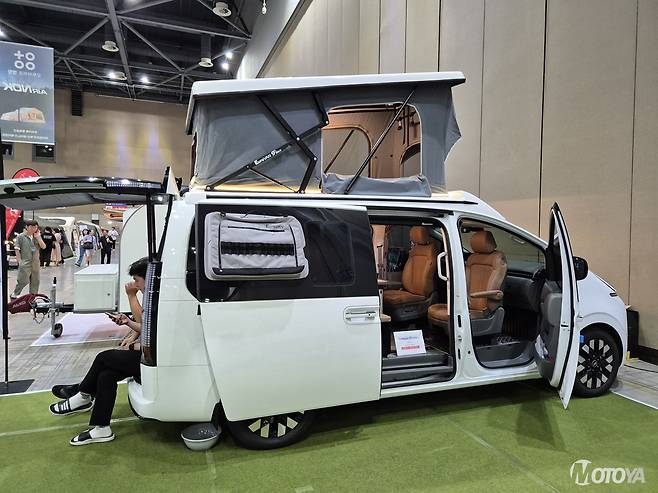 '캠핑카의 달인'으로 유명한 캠핑카마스터에서는 스타리아 기반에 4주식 팝업텐트를 적용한 시그니처S 모델을 선보였다. 하지만 이 모델의 진짜 중요한 부분은 따로 있는데, 바로 화장실이다. 운전석과 후방석 사이의 공간을 가변식으로 구성하여 정박시에는 넉넉한 샤워실/화장실 공간을, 이동시나 피크닉 등에서는 주방 키트를 화장실측으로 수납하여 워크스루가 가능한 구성을 가진다.