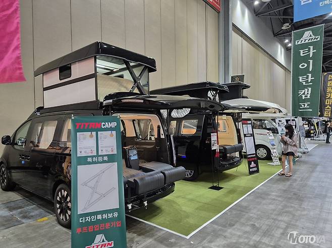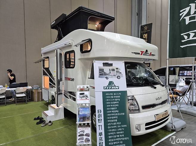 지난 6월 열린 코리아캠핑카쇼에서 4주식 팝업텐트를 적용한 1톤 캠핑카로 주목을 받았던 타이탄캠프에서는 업계에서 유일하게 하드쉘 타입의 팝업텐트를 적용한 모델을 선보였다. 히드쉘 타입의 팝업텐트는 통상의 소프트쉘 방식에 비해 결로나 단열 면에서 월등히 유리한 점을 가져, 캠퍼밴 스타일의 세미캠핑카를 찾는 소비자들의 눈ㄷ길을 끌었다.