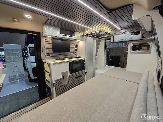 디파트에서도 비슷한 맥락의 캠핑카를 선보였다. 다만, 이쪽은 팝업텐트 없이도 적용이 가능하다는 점이 특징이다. 이 모델은 차량의 후미부에 화장실을 배치했다. 사용시에는 탬버도어를 이용해 외부와 차단하는 방식이다. 인테리어는 아기자기하게 잘 꾸며져 있으며, 다양한 편의시설을 제공하여, 성인 2명이 사용하기에 알맞은 구성을 제공한다.