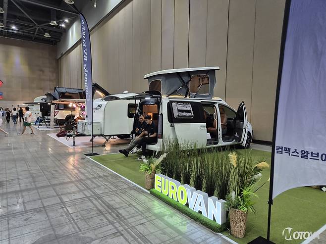 국내에서 스타리아 기반 캠퍼밴으로 많은 사랑을 받고 있는 컴팩스RV코리아는 신개념의 팝업텐트를 적용한 유로밴 플렉스를 선보였다. 유로밴 플렉스는 기존 삼각형으로 전개되는 루프의 반대편을 더 크게 들어 올리는 방식으로 4주식 루프를 구현했기 때문이다. 그 뿐만 아니라 구조 상, 필연적으로 전동식을 주력으로 사용하게 되는 종래의 4주식 팝업텐트와 달리, 이 루프는 기존 삼각 루프와 동일하게 오직 수동으로, 그것도 아주 손쉽게 전개와 철수가 가능한 구조를 채용하고 있으며, 그 덕분에 가격 또한 전시장 특가호 660만원에 불과해 많은 주목을 끌었다.
